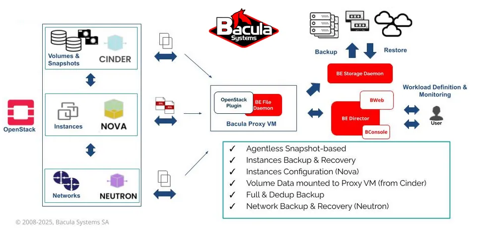 Bacula Systems’ OpenStack Backup Solution is a powerful, enterprise-grade backup and recovery platform tailored for OpenStack environments. It provides native integration with OpenStack components such as Nova, Cinder, and Swift, offering unmatched flexibility, scalability, and security. Designed for complex and demanding infrastructures, it ensures consistent, efficient, and agentless protection of virtual machines, volumes, and object storage.