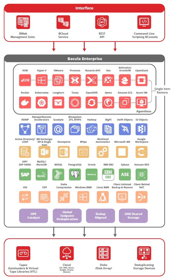 Bacula Systems’ OpenStack backup solution delivers native, agentless protection for Nova, Cinder, and Swift components, enabling efficient, scalable, and secure data backup and recovery across complex OpenStack environments. It supports snapshots, deduplication, and automation for enterprise-grade performance.