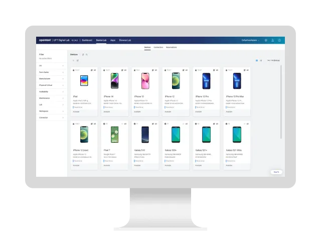 OpenText™ Functional Testing Lab for Mobile and Web provides a centralized, enterprise-level digital lab of real mobile devices, browsers, and emulators. With remote access, developers and testers can develop, debug, test, monitor, and optimize mobile apps from anywhere.