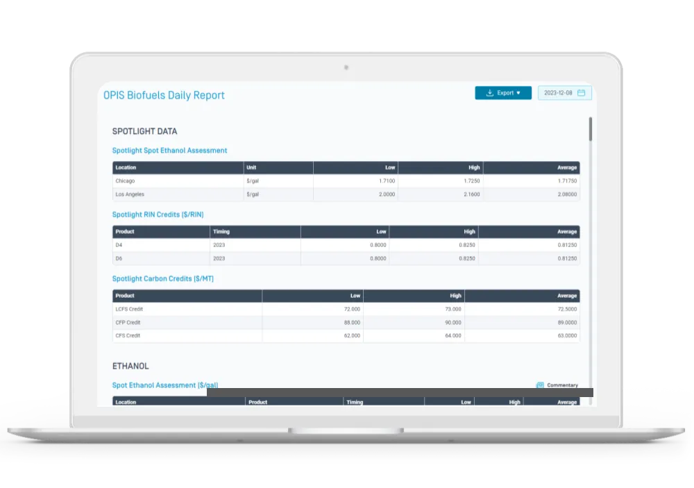 The OPIS Biofuels Daily Report provides comprehensive coverage of biofuels prices, market trends, and breaking news, helping you stay ahead in the dynamic biofuels sector. It allows you to easily keep up with the complex and evolving biofuels market, navigating through shifts in the political landscape, regulatory uncertainties, and transportation challenges. You can seamlessly access up-to-date biofuels prices, breaking news, and insightful analysis via OPIS Context, an interactive and customizable web platform. Stay informed with the latest developments in biofuels through our comprehensive reporting, ensuring you stay ahead in the ever-changing landscape of biofuels news. Utilize OPIS biofuels spot price assessments to effectively oversee trade books, make informed decisions in wholesale fuel transactions, predict biofuels market trends, and track compliance costs linked to clean fuels programs. Stay ahead in the industry by relying on our accurate and timely information on biofuels prices, ensuring you have the insights needed for strategic decision-making in the dynamic biofuels market.