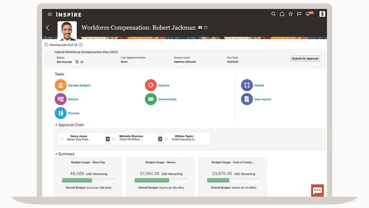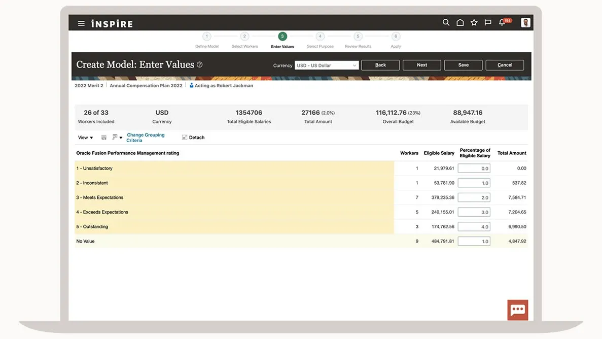 Worker-level budgeting Use modeling to calculate amounts based on relevant criteria to see what the actual cost would be and allocate the final amounts. Manager-level budgeting Provide managers with the ability to distribute amounts to their directs or all managers in the organization. Real-time employee data Make decisions about compensation plans using connected, relevant employee data from Oracle Cloud HCM.