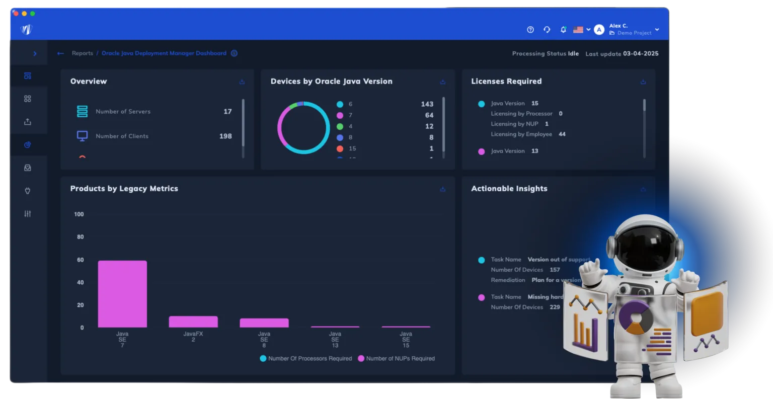 Designed to help gain control of Oracle licensing. OJDM analyzes and helps manage Java licensing and enables organizations to track usage and ensure compliance with Oracle's Java licensing policies. It provides real-time visibility into license usage, identifies compliance issues, and helps reduce costs, avoiding legal or financial risks.
