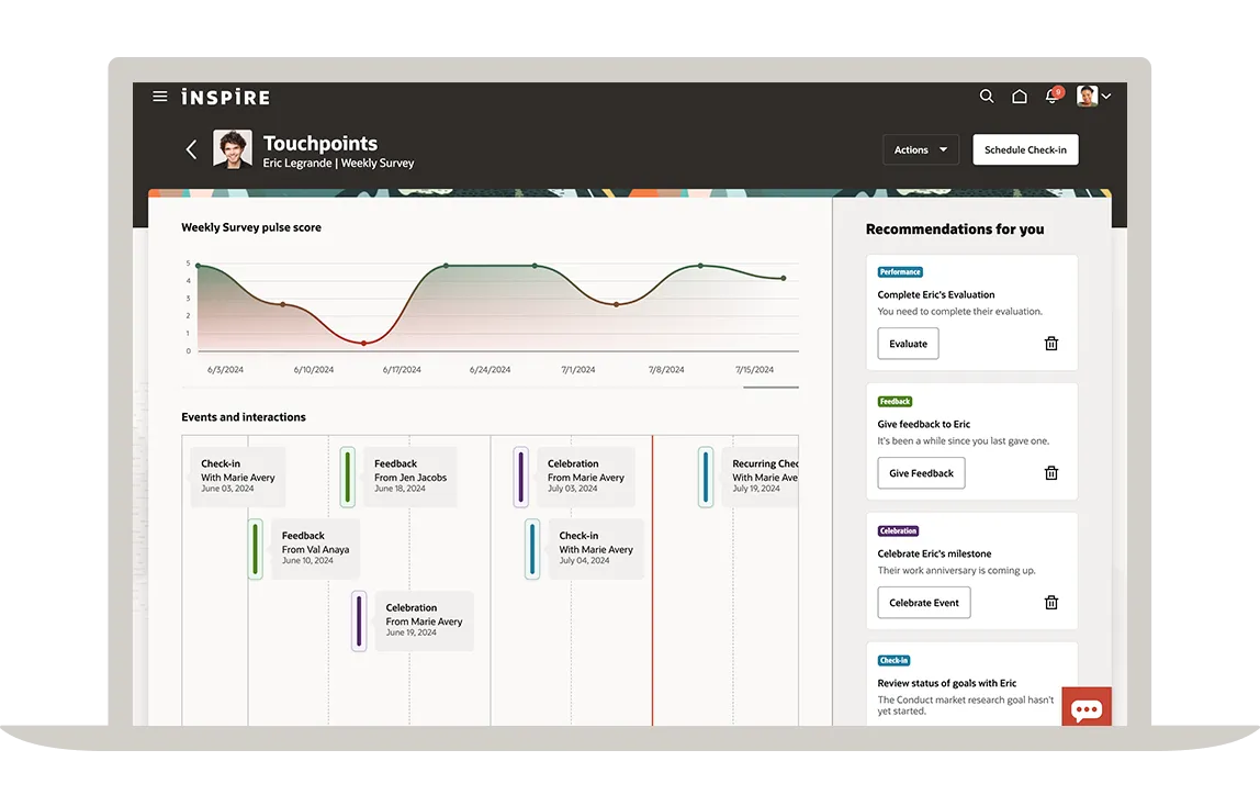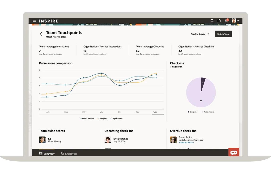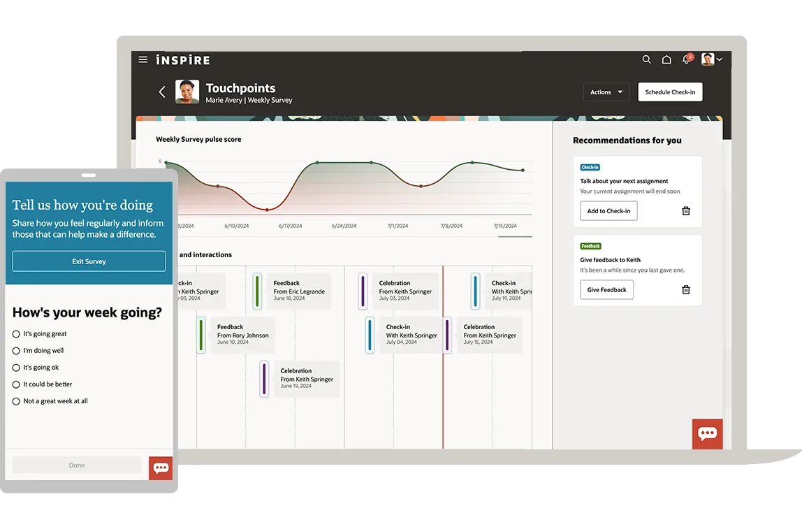 Oracle Touchpoints uses data across a unified HCM suite to provide managers with personalized team insights, recommended actions, and continuous engagement opportunities so they can empower their people to show up as their best selves every day.
