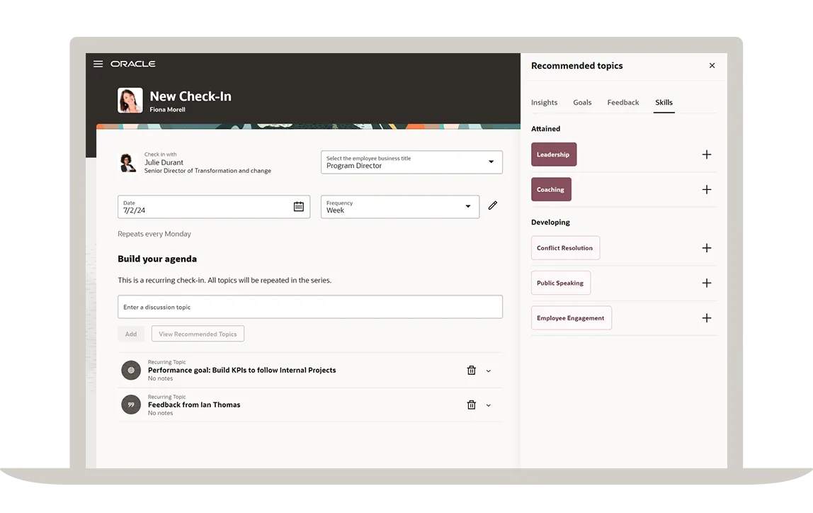 Employee check-in organizer Help employees and managers maintain a regular check-in cadence with a single place to schedule and view past and upcoming check-ins. Nudges Provide direct links to recommended engagement actions—such as giving feedback— based on interactions and employee data. Recommended discussion topics Add recommended discussion topics to check-ins that dynamically update based on interactions across the HCM suite—including skills , goals, feedback, and more. Celebrations Recognize employees with messages from managers that highlight important moments, such as a contribution or milestone.