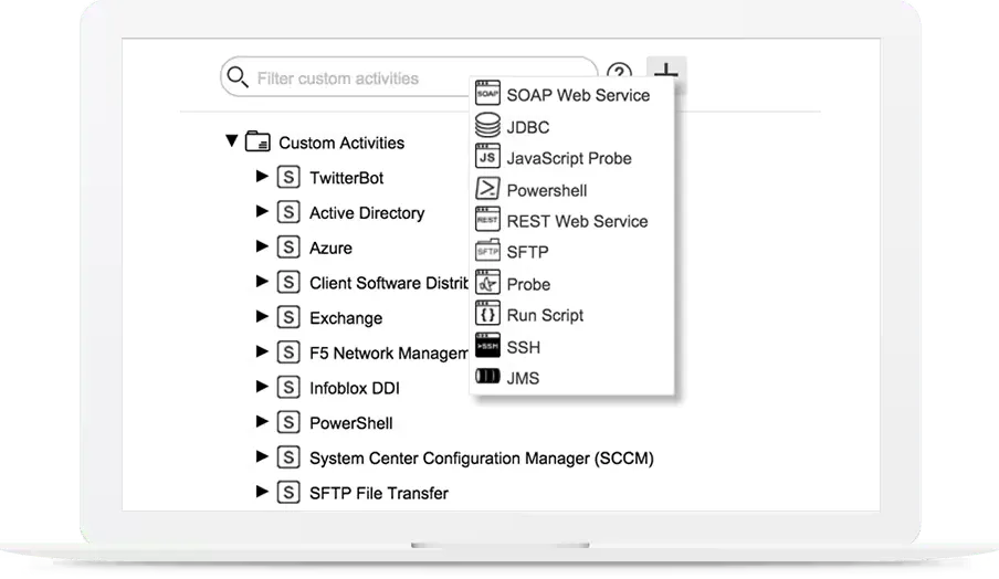 Pre-built Activities and Templates Orchestration includes a wide range of pre-built activities and templates for common IT tasks.