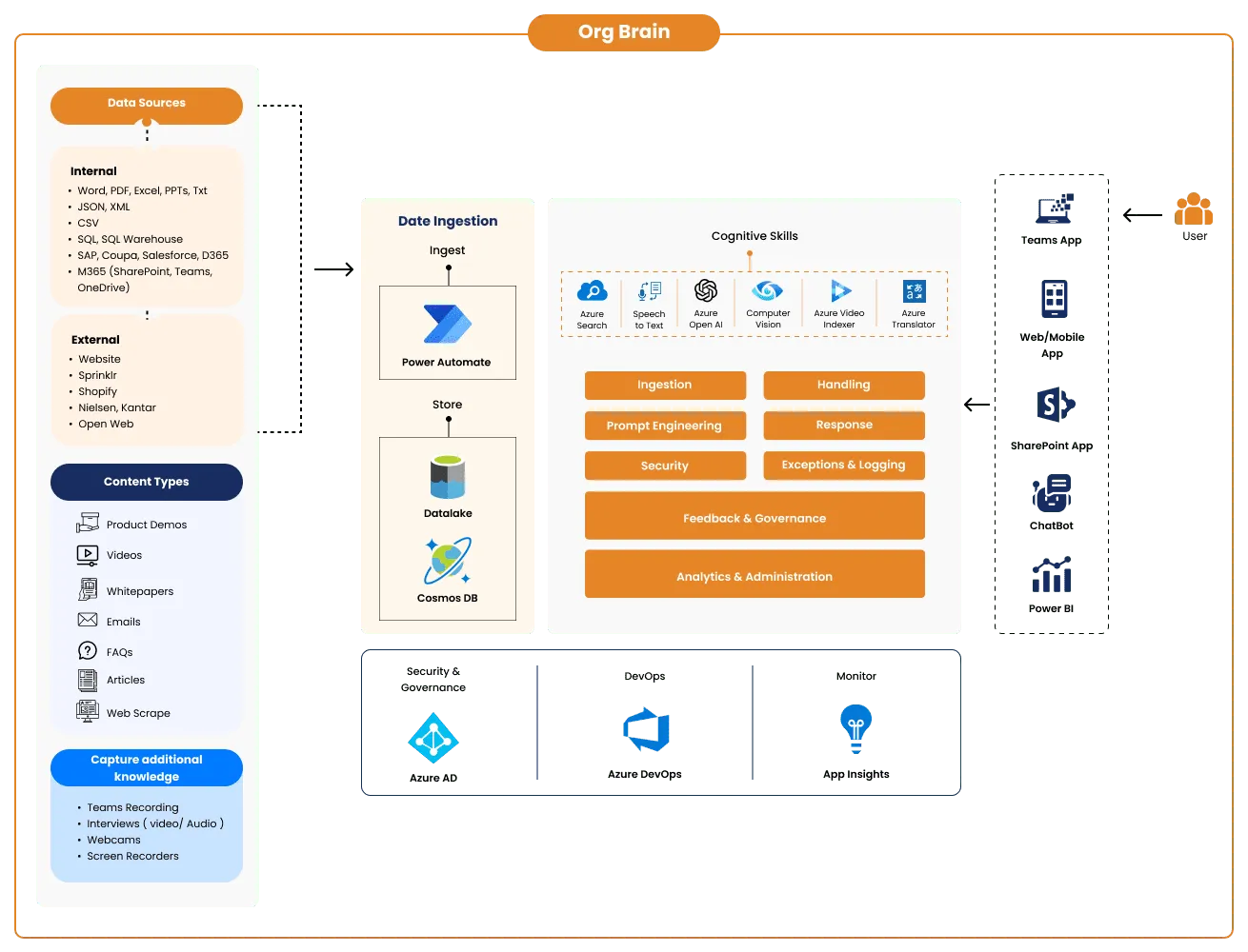 Harness the Collective Knowledge of Your Organization Experience the power of Generative AI unleashed with Org Brain, our unique enterprise Generative AI Platform. Designed to evolve alongside your organization, Org Brain intelligently harnesses your enterprise data to deliver customized, smart solutions. It embodies a living-learning system that seamlessly adapts to your business landscape, consistently fueling efficiency, enhancing performance, and bolstering competitiveness. The architecture of Org Brain stands out with its personalized queries for in-depth insights, reliable security measures for protecting data, agile governance system that progresses with user feedback and adheres to policies, and advanced analytical prowess that yields profound insights for performance optimization. These powerful elements mark Org Brain as an invaluable ally in your quest for superior business intelligence.