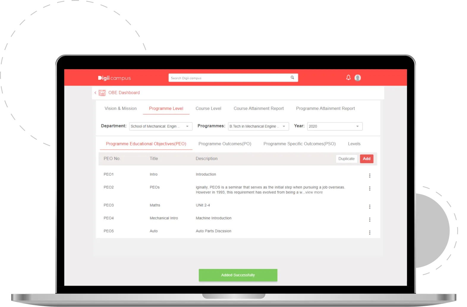 Digii's Outcome-Based Education (OBE) module is a comprehensive solution designed for educational institutions. It adopts a learner-centric approach, enabling institutions to precisely define, map, and visualize their curriculum in relation to specific goals, desired outcomes, and competencies. The system facilitates the configuration of course outcomes to assessments, allowing for direct measurement of learning achievements. It also provides single-click OBE reports for streamlined evaluation and analysis. Digiicampus aims to measure institutional outcomes to deliver improved quality education, transforming higher education through innovative digital solutions that streamline operations and enhance learning experiences.