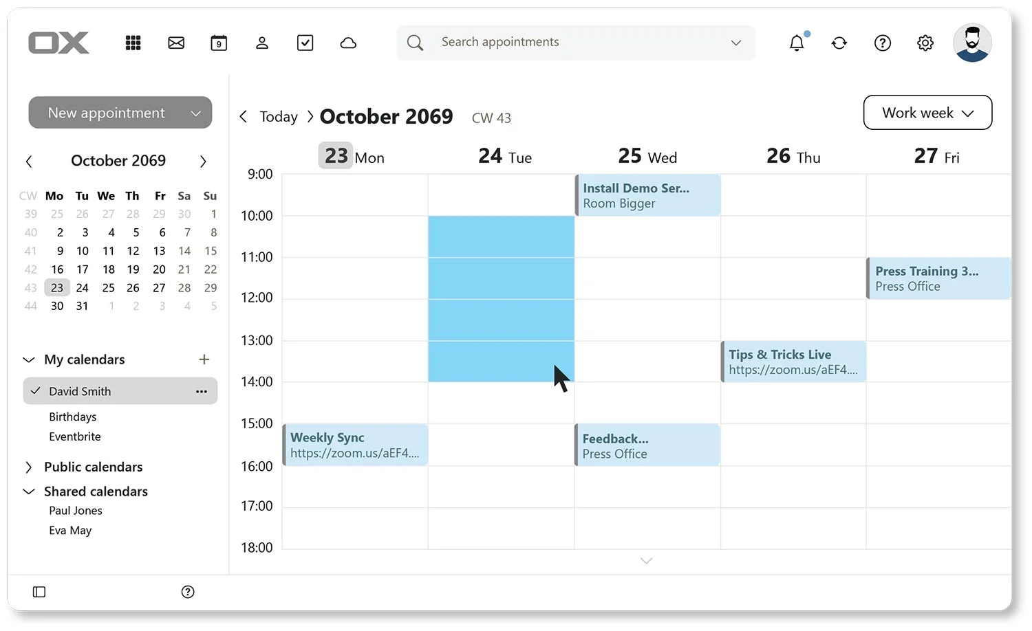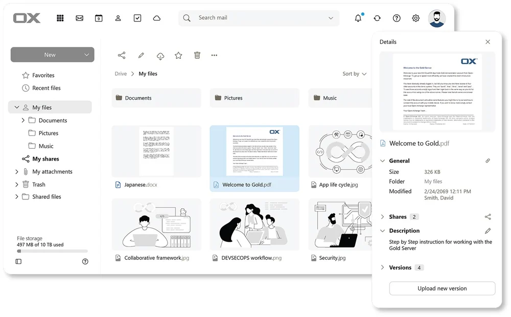 OX App Suite Cloud is a fully hosted and managed email and collaboration platform designed for service providers, businesses, and consumers. It offers a seamless user experience across devices, integrates AI-powered features, and includes tools for upselling and customer engagement. With global data centers, strict SLAs, and geo-redundant infrastructure, it ensures reliability, scalability, and security. The platform supports email, calendar, cloud storage, document editing, and more, all accessible via web and mobile apps.