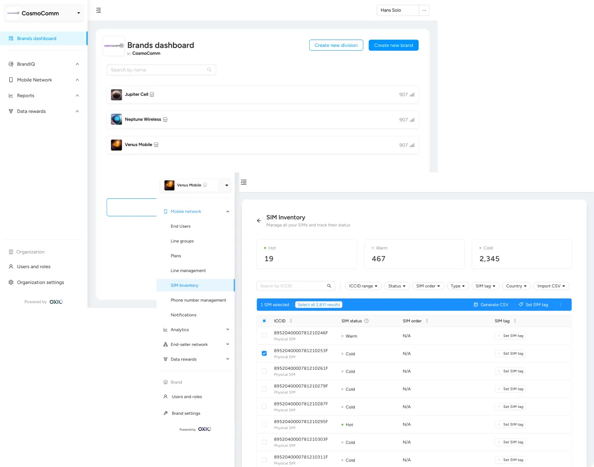 Build and launch mobile and data plans – no telecom expertise required With OXIO’s cloud-based portal, spin up your own personalized mobile service in minutes. BrandVNO makes it easy to create your own telecom product and design custom plans built to your specifications. OXIO manages all the technical aspects of telecom and distills the experience into flexible online dashboards and a modern API. Get started with no integrations in our Telecom-as-a-Service platform, or check out our API documentation to learn more about how to integrate OXIO directly into your digital products.