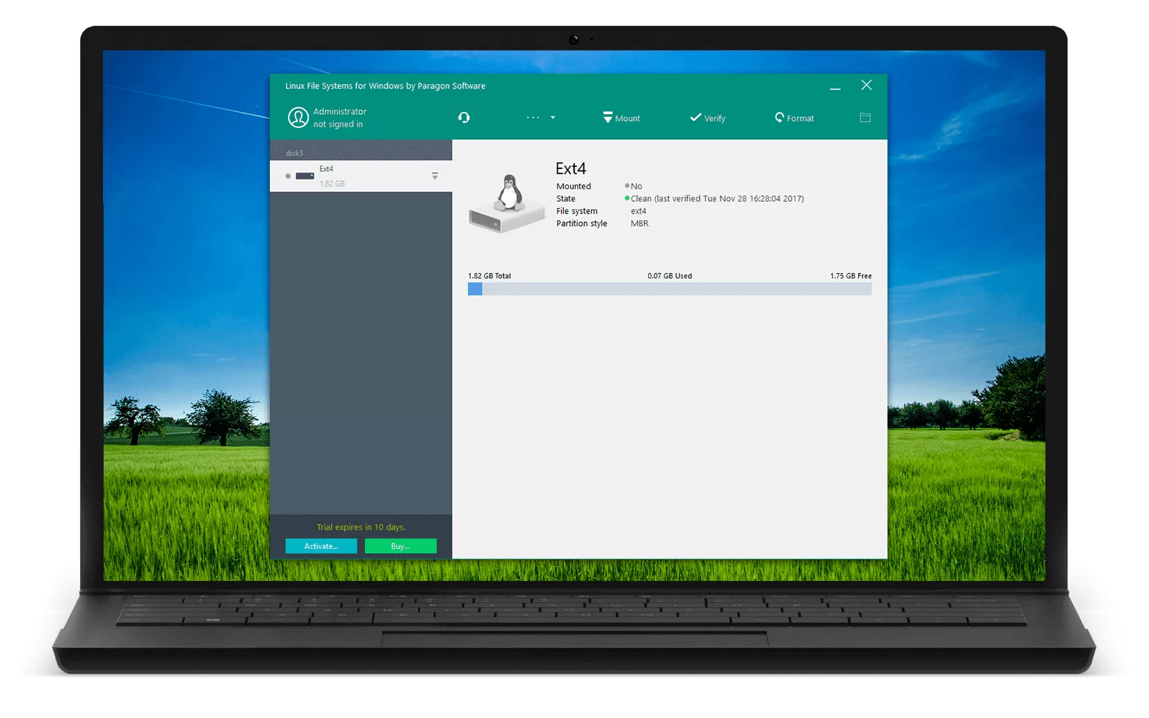 Linux File Systems for Windows by Paragon Software is a unique tool which gives you full access to Linux volumes within Windows. Just plug your hard disk with ExtFS/Btrfs/XFS partitions into your PC and instantly work with any media on the Linux partitions.