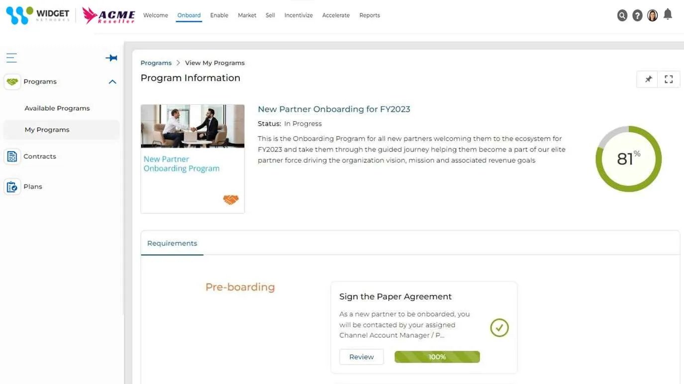 Partner onboarding and enablement management module for automating, tracking, and controlling partner program workflows and engagement.