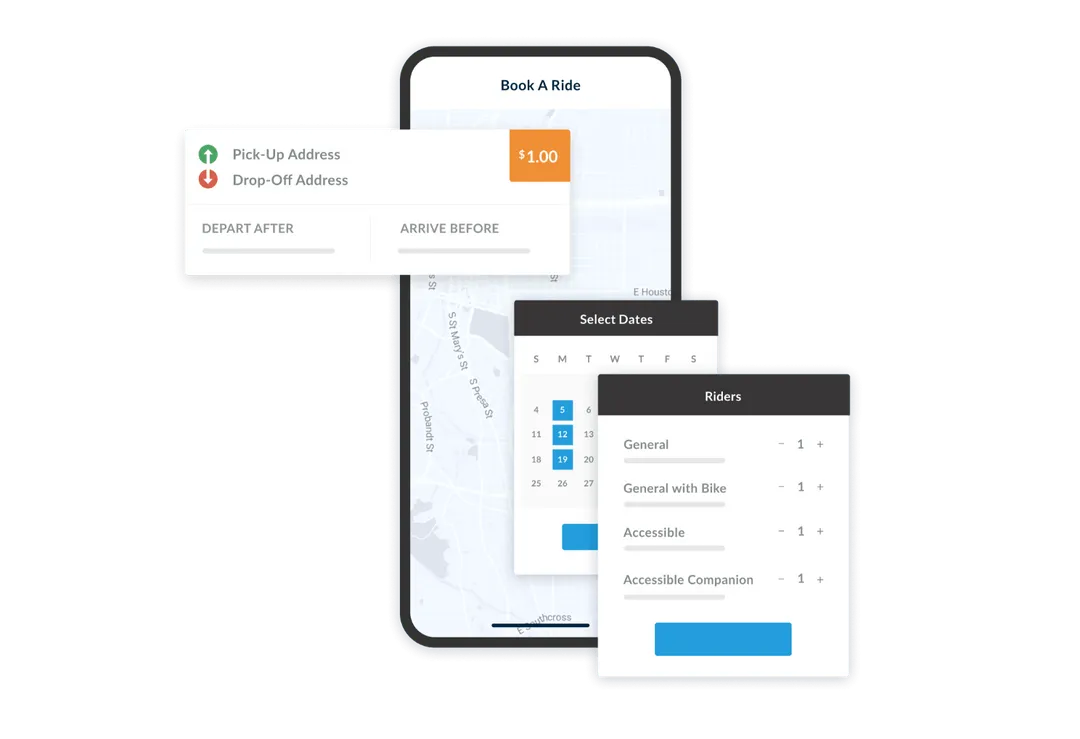Cloud-based app for booking, managing, and tracking on-demand or scheduled transit rides, supporting both microtransit and paratransit services.