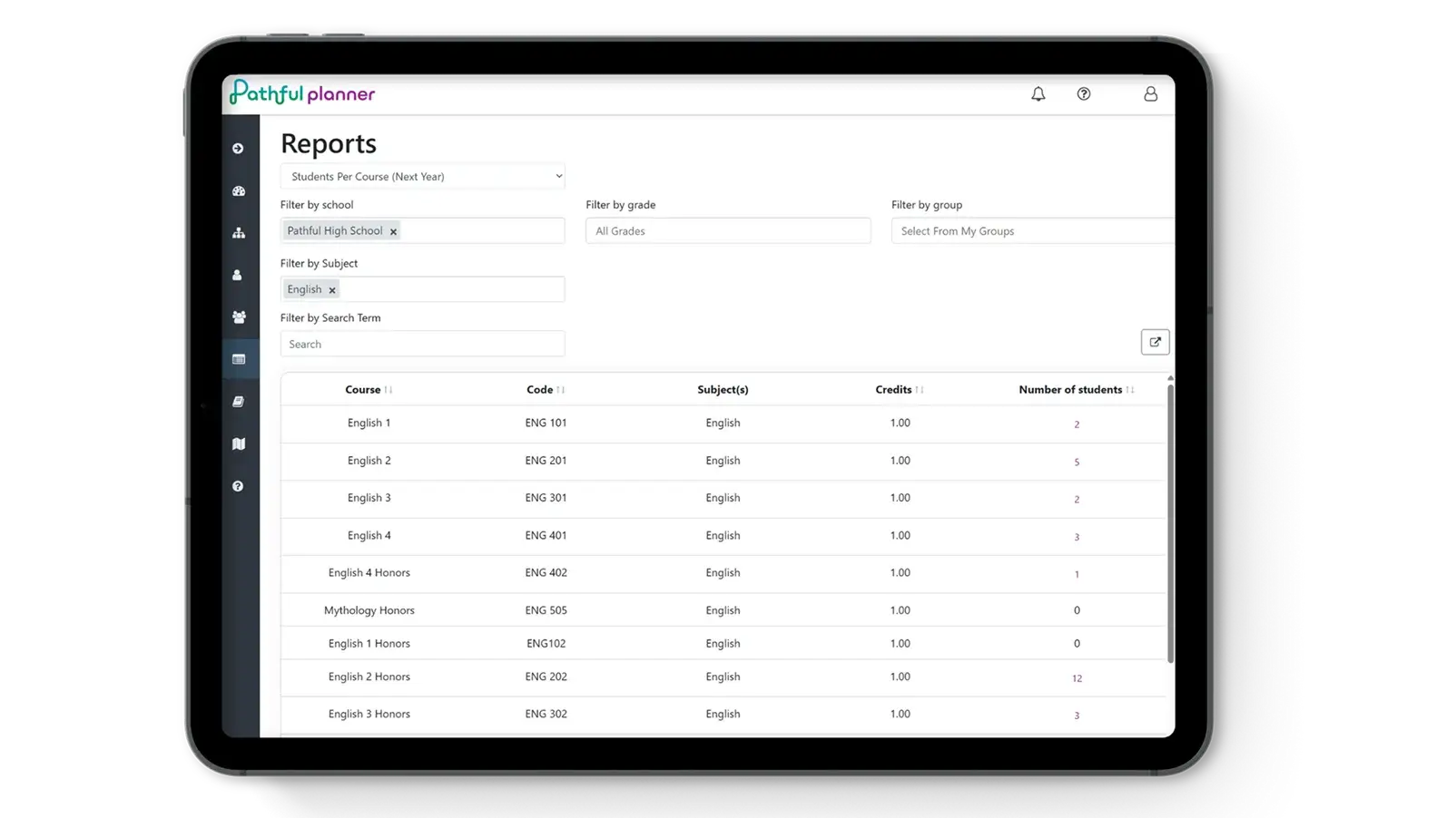Reports on students per Pathway, students per Course, and more, can help to predict future staffing needs and course offerings.
