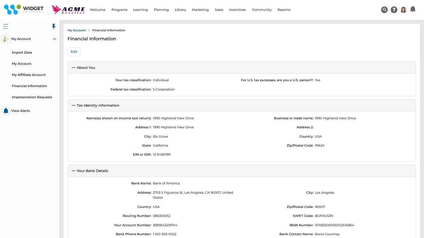 Partner Financial Information Management Securely collects and stores partner payment and tax information.