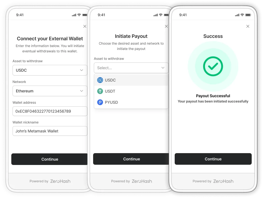 Zero Hash Payouts enables businesses to deliver instant, global, on‑chain payouts through a unified and compliant infrastructure. The solution simplifies the disbursement of funds across borders by abstracting blockchain settlement, compliance checks, liquidity handling, and transaction orchestration.