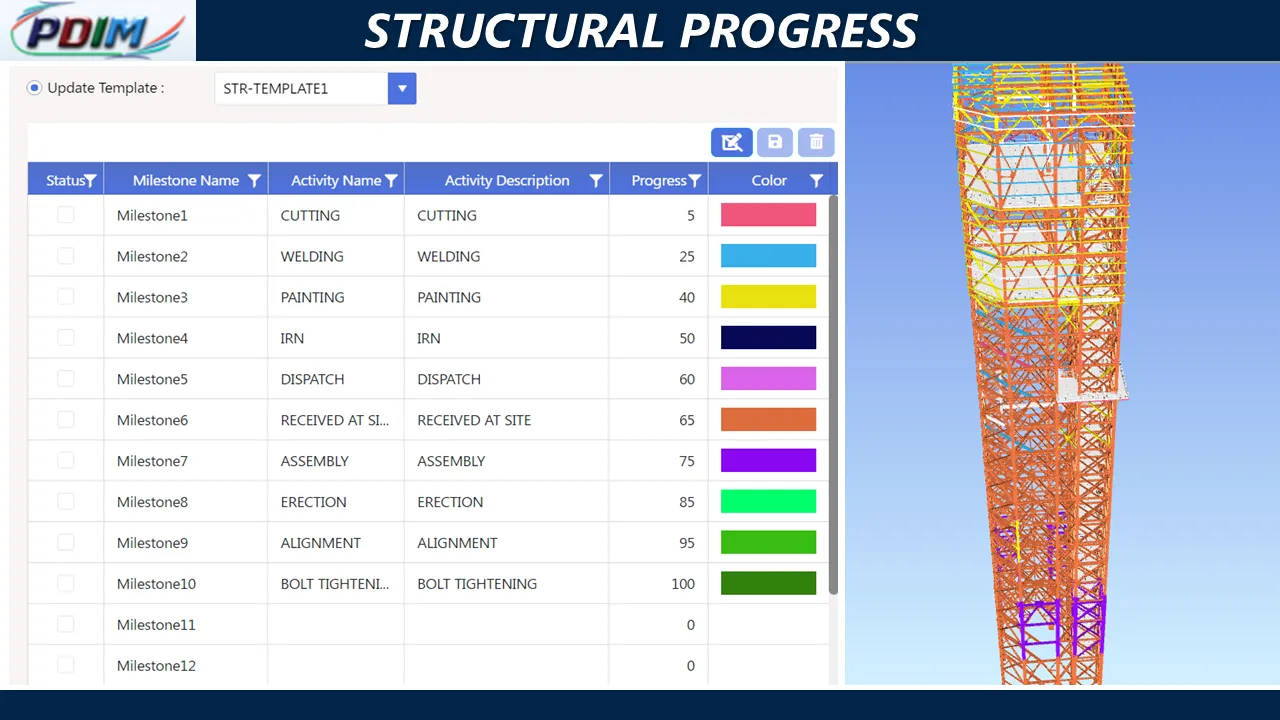 - Dynamic configurable Progress Milestone with Progress Colour Code definition for 3D progress visualization in 3D model