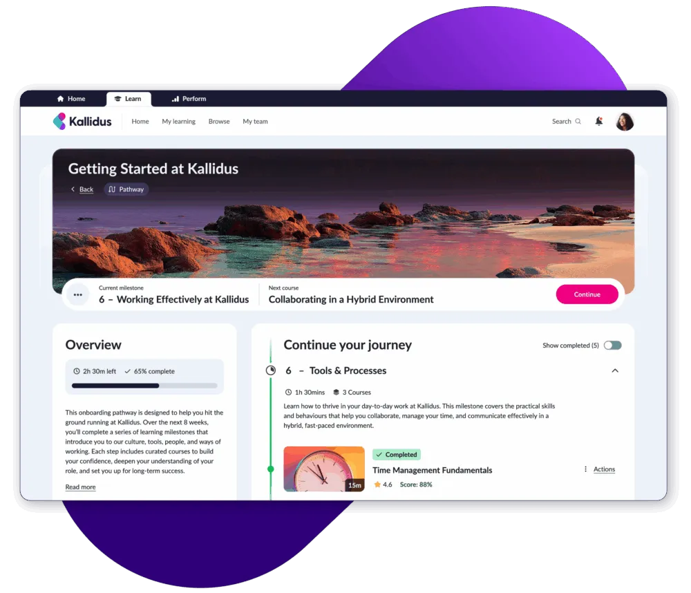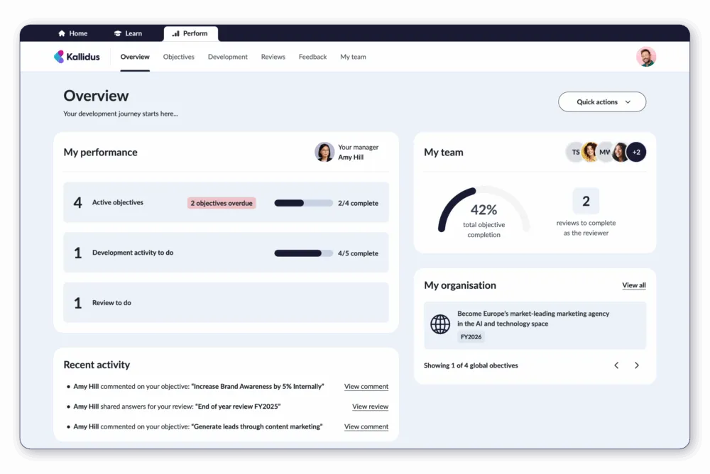 Kallidus’ Performance Management software is designed to modernize and streamline how organisations manage employee performance. It replaces rigid annual reviews with continuous feedback loops, check-ins, goal tracking, and alignment with learning objectives. It enables managers and employees to monitor progress in real time, carry out reviews more dynamically, and link development plans to performance outcomes. The solution is cloud based and built to integrate performance with learning, simplify administrative overhead, and drive engagement and accountability.