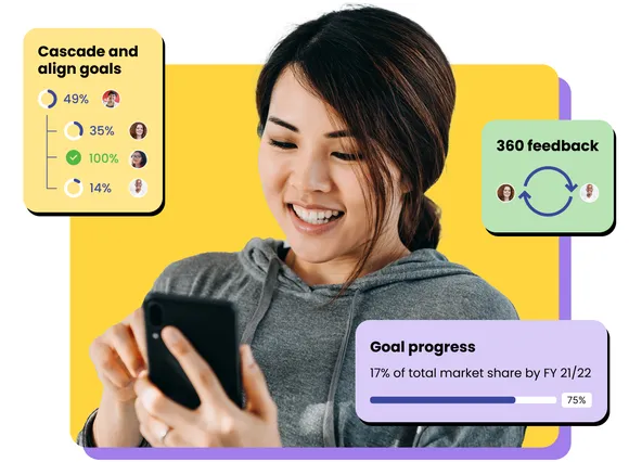 Effortless goals & OKRs tracking Enable leaders to easily assess performance trends across key metrics and business functions, address issues in a timely manager, and reduce flight risk and disengagement.
