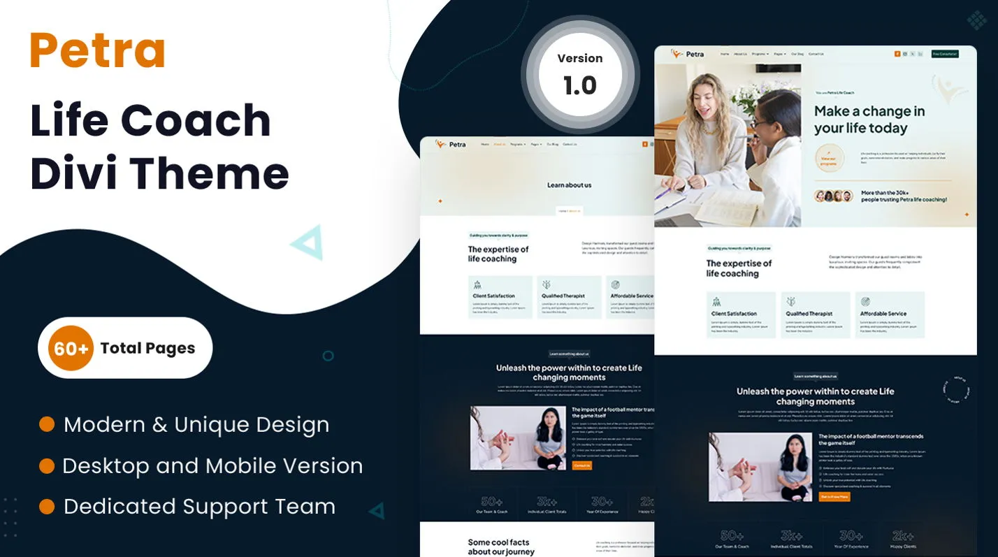 Petra is a modern and elegant Divi child theme designed for life coaches, mentors, and personal development experts. It comes with a multi-page layout built using Divi modules, making it easy to customize. The theme includes a prebuilt global header and footer for a seamless experience. Petra features sections for coaching programs, client testimonials, blog posts, and contact forms, helping coaches connect with their audience. It is fully responsive, fast-loading, and designed to boost engagement. Whether you offer one-on-one coaching, online courses, or workshops, Petra is the perfect theme to grow your coaching business.