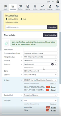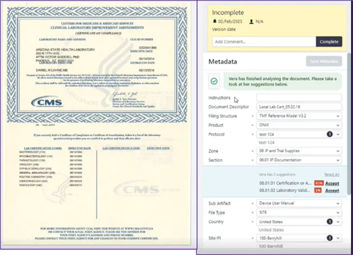 - Delivers guidance of hundreds of TMF experts at the document upload step, helping prevent the risk of TMF document misfiles and metadata errors before they occur