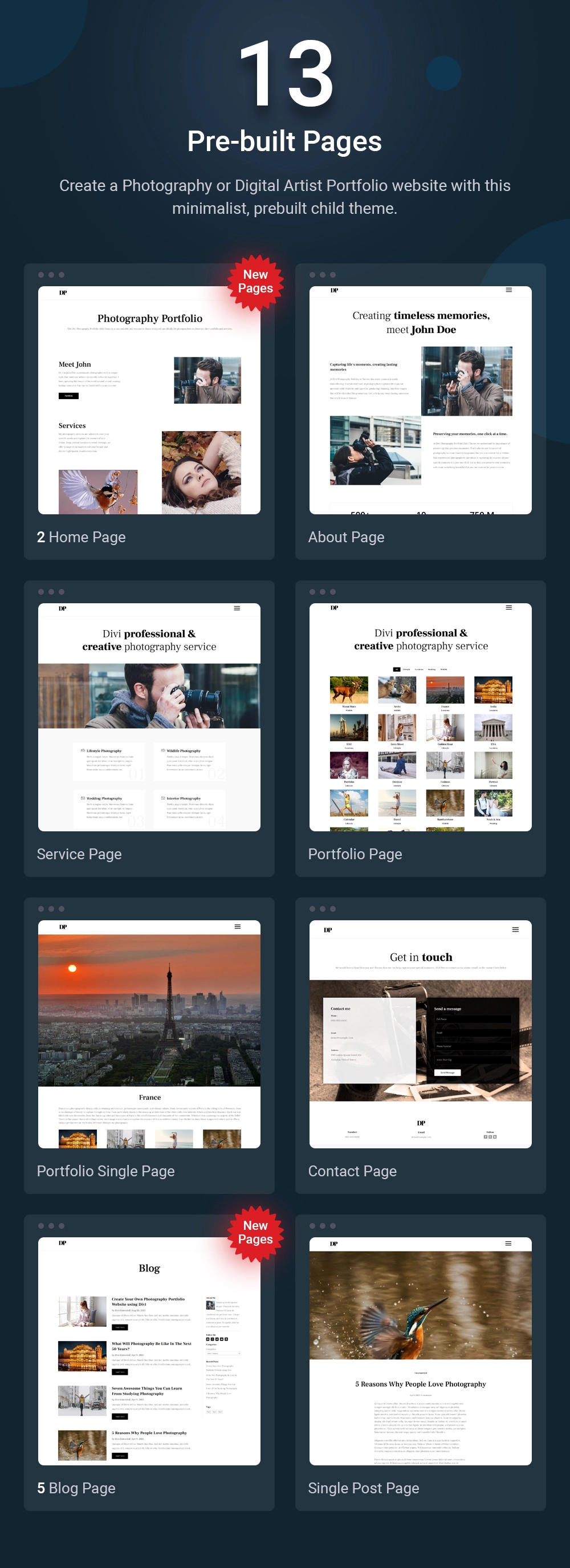 Elegant Divi layout pack for photographers with 9 pages, lightboxes, hover effects, and royalty-free visuals.