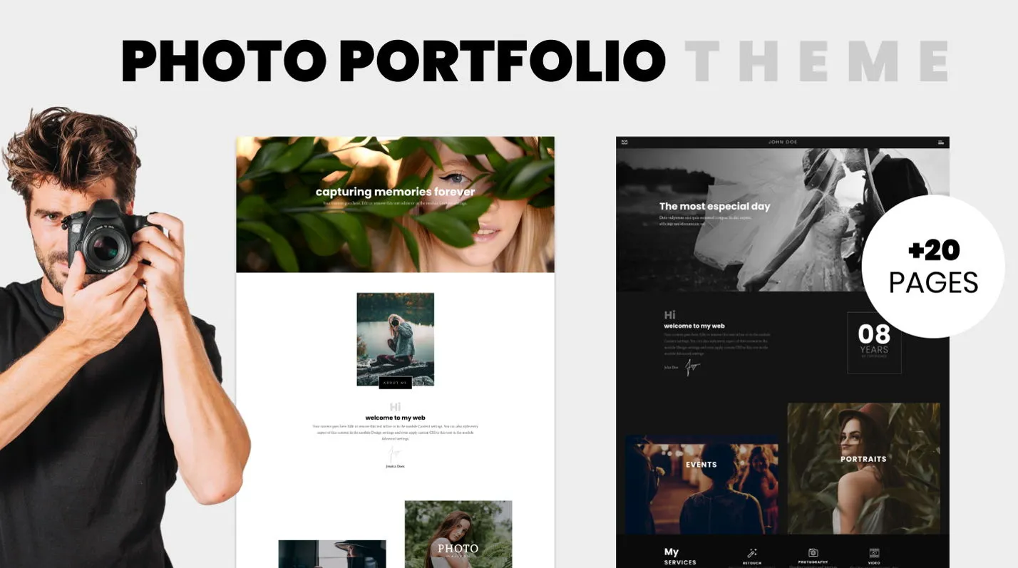 A modern Divi child theme for photographers and videographers with 36 layouts, light/dark modes, and premium plugins.
