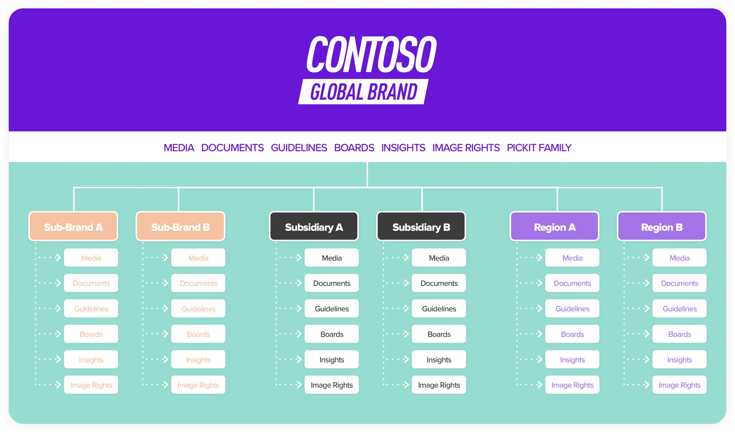 With Pickit Family, you can implement a flexible, multi-brand architecture that simplifies how your asset libraries are accessed, created, and controlled. Whether managing assets across several markets or dealing with multiple sub-brands within your organization, Pickit Family provides the ideal solution. Pickit Family allows you to create identical asset collections, document libraries, and templates that are accessible to each sub-account. Simultaneously, you have the flexibility to share custom logos, brand guidelines, templates, and campaign materials to specific countries, regions, or sub-brands, ensuring better brand consistency and effortless content distribution.