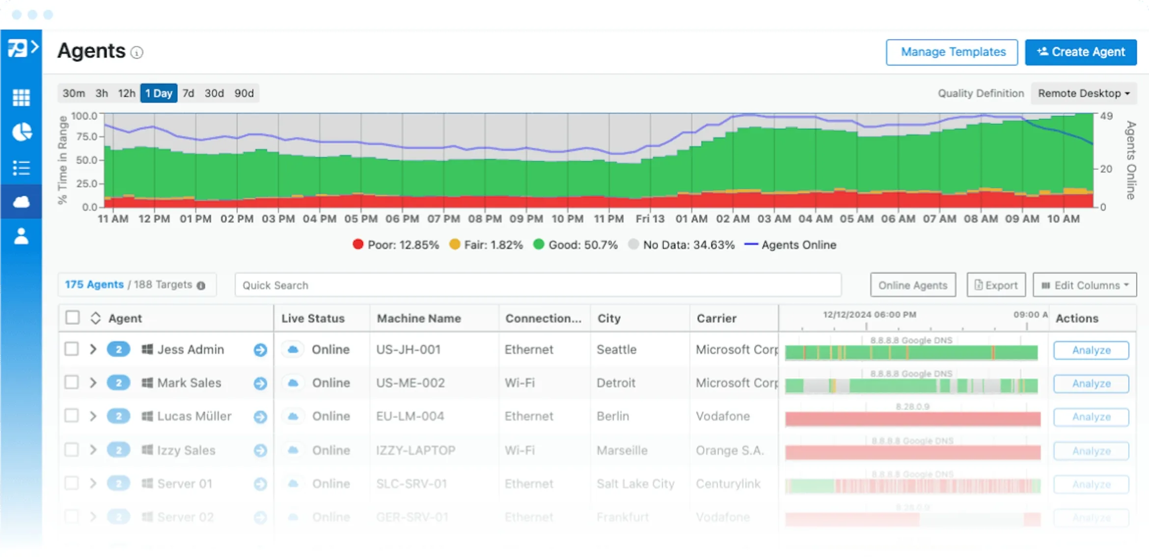 Cloud-based network monitoring platform for tracking latency, packet loss, and connectivity issues across distributed environments.