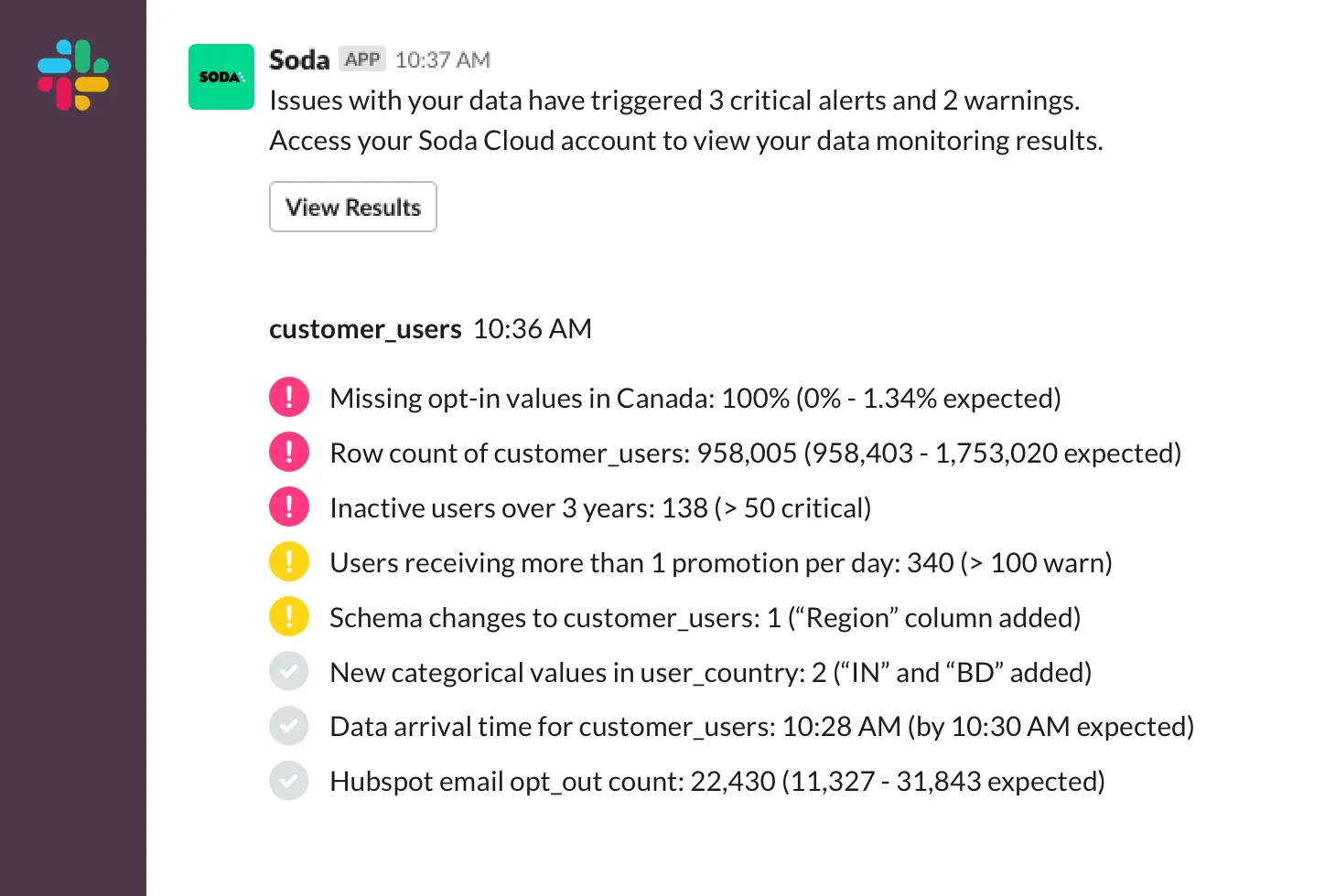 - Soda Cloud Collaboration: Centralized dashboards, alert routing to Slack, Jira, MS Teams, incident tracking, and no-code/low-code data contracts to align data producers and consumers.