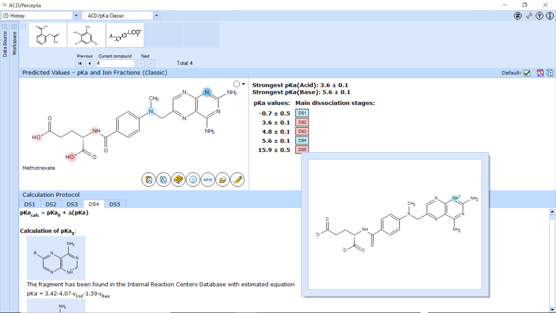 - Estimation of the reliability of calculated pKa (in ±log units). Detailed calculation protocol for each predicted ionization (referred to as dissociation stage). Hover on a dissociation stage to see the related ionizable center highlighted on the structure. Click structure fragment to see it highlighted on the structure.