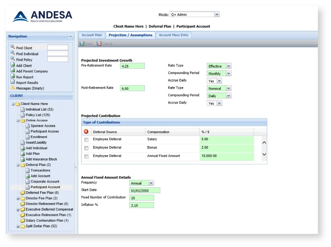 Modern Technology Andesa’s Plan Administration solution leverages cloud-based software technology to meet modern, sophisticated recordkeeping requirements for true long-term success. Our scalable software is designed to support nonqualified plans with input from top firms in the industry. Integrating with other solutions in the Andesa technology ecosystem to prevent redundant data entry and errors, our Plan Administration platform assists carriers, brokers, sponsors, and participants in achieving a unique level of liability management and recordkeeping support for a range of plan designs.