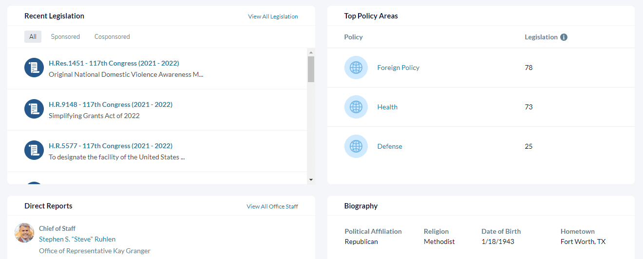 Improved Stakeholder Identification Quickly identify relevant policymakers and staff.