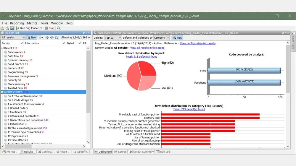 Polyspace Bug Finder Server is a static analysis engine that identifies common classes of bugs in C and C++, including run-time errors, concurrency issues, and other coding defects.