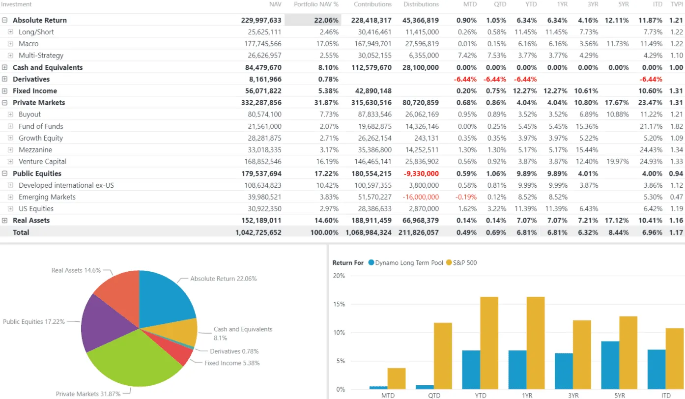 Dynamo’s Portfolio Management software is a comprehensive multi-asset portfolio management system for LP investors to centralize and report on investment performance at the individual, asset class, and portfolio levels.