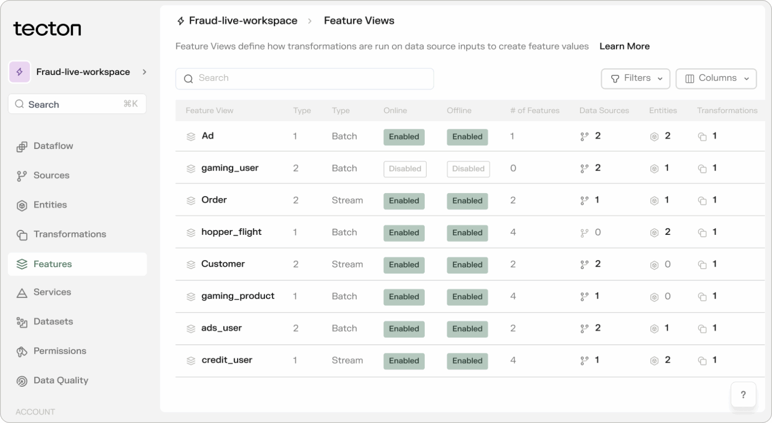 Gain a complete view of your feature pipelines Tecton’s Feature Store provides a single pane of glass for all of your ML features. Visualize and manage ML features across all models and AI applications. Eliminate rogue pipelines and prevent feature sprawl, ensuring an organized feature environment that reduces redundancy.
