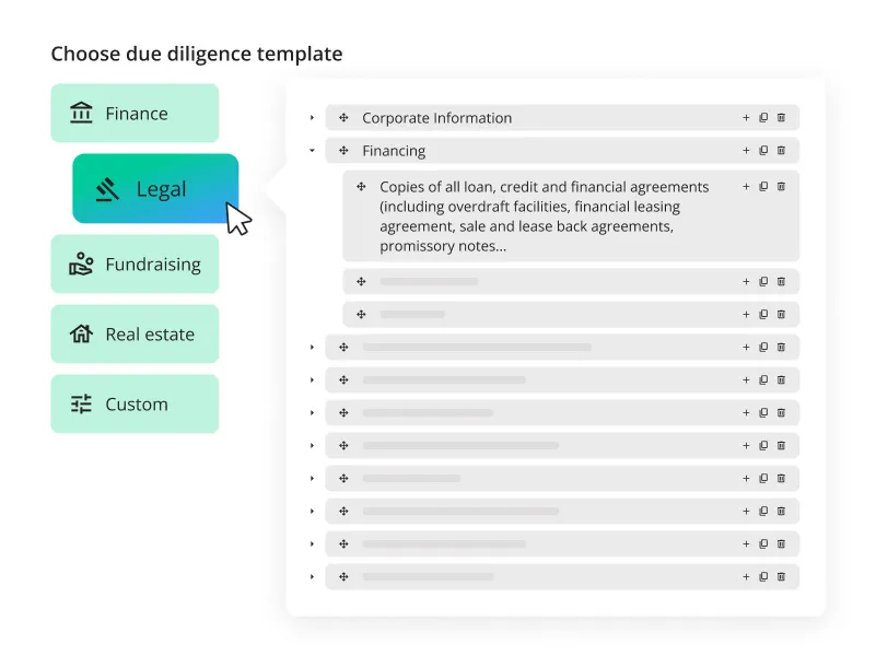 Use tailored templates with advisor-approved folder structure recommendations to create a professional due diligence structure. Let your advisors focus on closing the deal—not organising a data room.