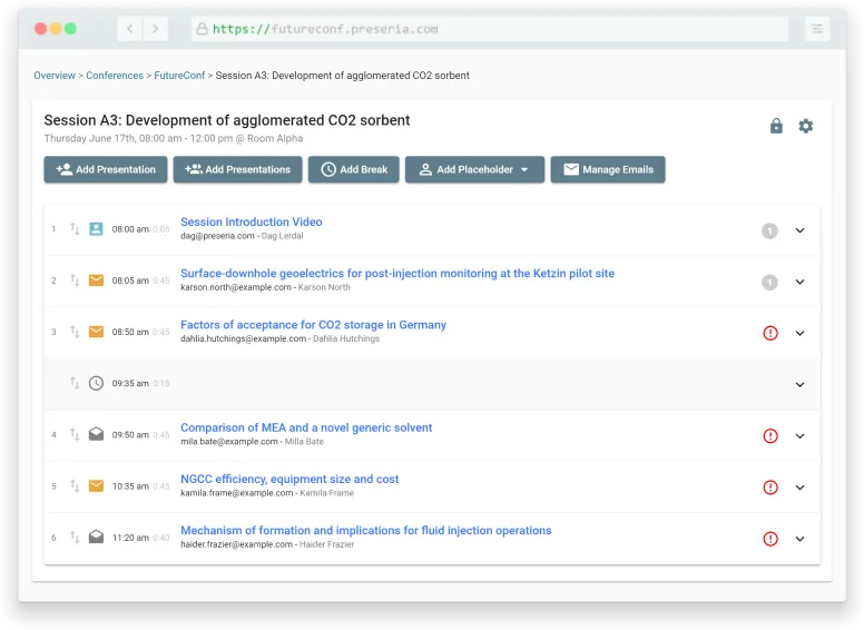 Invite or remind speakers to upload their presentation files using templates from the email template library. Create your own custom templates, with instructions tailored to your event, and add your event’s branding or logo. Invited speakers receive an email with your instructions along with a unique link that let’s them upload files to their presentation slots. Emails sent to speakers are delivered fast and reliably with detailed open and click tracking. If a mailbox cannot be reached you are immediately notified.