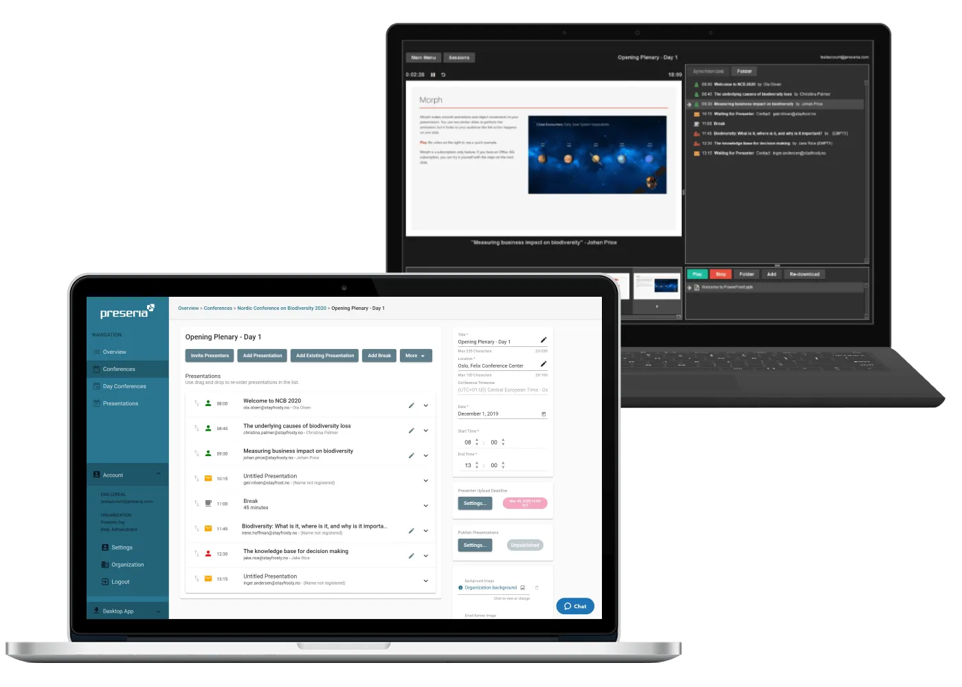 Our app for Windows 10 will let you launch presentation files (currently PowerPoints, PDFs, Videos and Images) in full-screen onto your projector screen while showing a control panel on your primary screen. This enables you to seamlessly switch between presenters and their presentation files without the need for expensive video mixer equipment. The app also comes in a simplified mode, often preferred by AV tech crews that want full control over the playback, that just downloads and synchronizes the uploaded presentation files. This mode is available for both Windows and macOS. Both the Preseria web app and the desktop app works great with an on-site Speaker Ready Room as organizers and their tech crew can easily upload files on behalf of presenters.