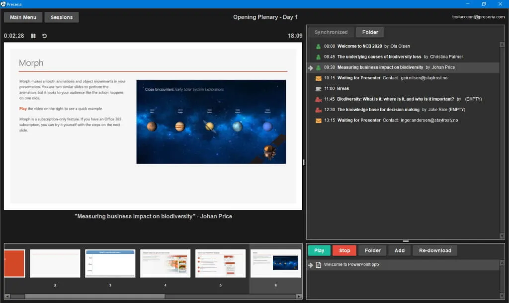 The Preseria desktop app lets you seamlessly display and switch between PowerPoints, PDFs & videos by different speakers.