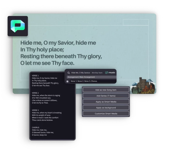 Build your presentation with an ever-growing library of motion backgrounds, still images, graphics, and more—without ever leaving Proclaim.