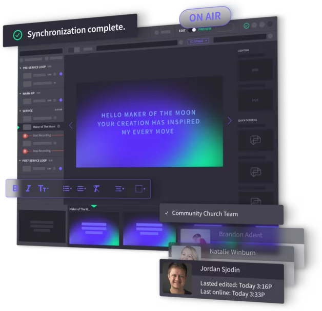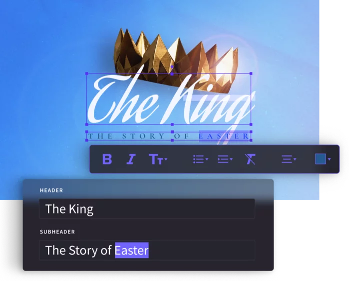 Proclaim is cloud-based presentation software built specifically for churches, so you can design slides, create presentations, and record or stream sermons—without all the manual work.