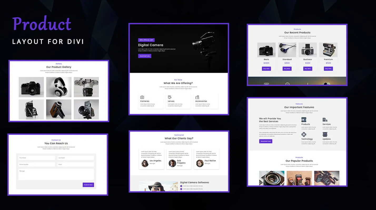 Modern Divi layout for showcasing products with responsive design and customizable sections.