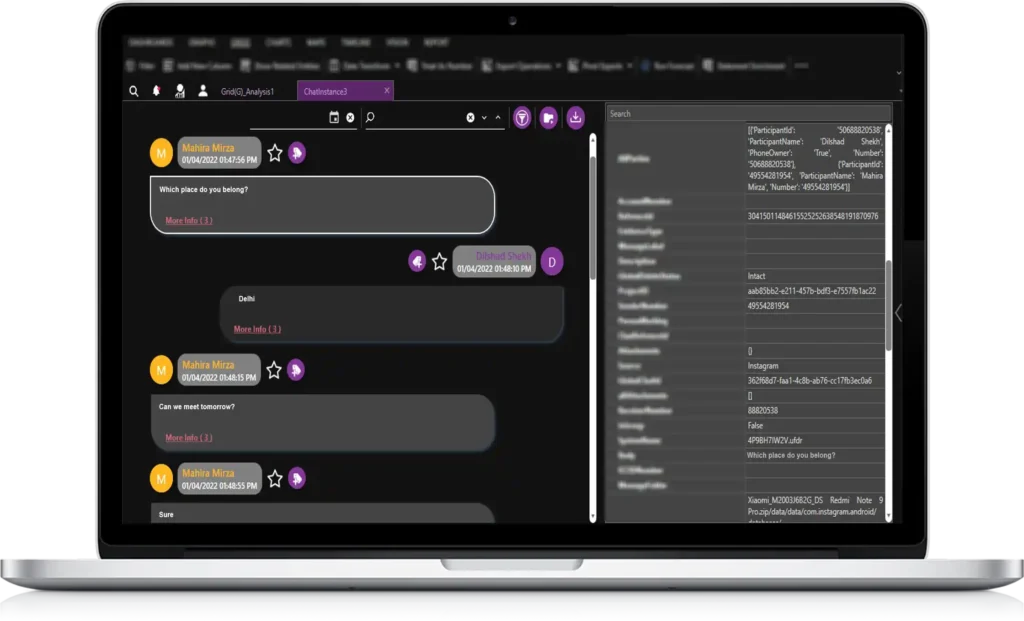 - Chat Analysis: Identifies criminal networks through cross-platform pattern recognition.