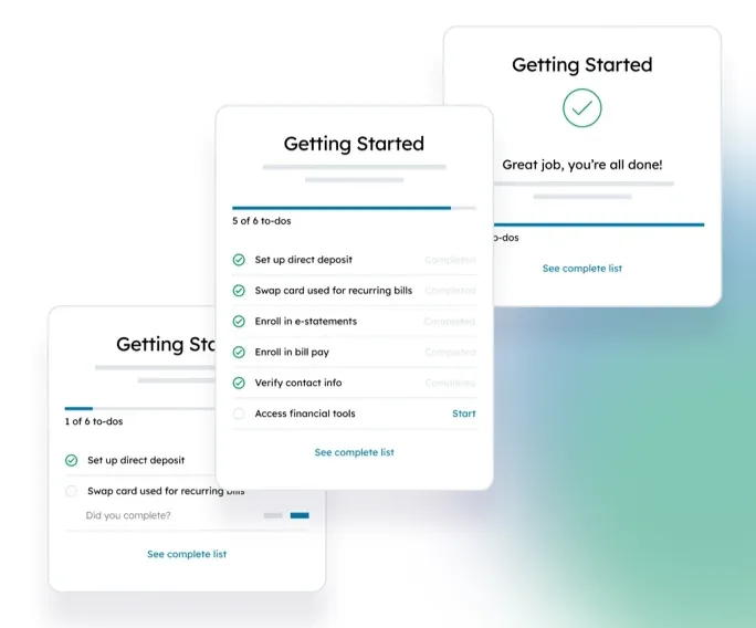 Allow account holders to track their progress with an easy-to-read checklist that gamifies and celebrates task completion.