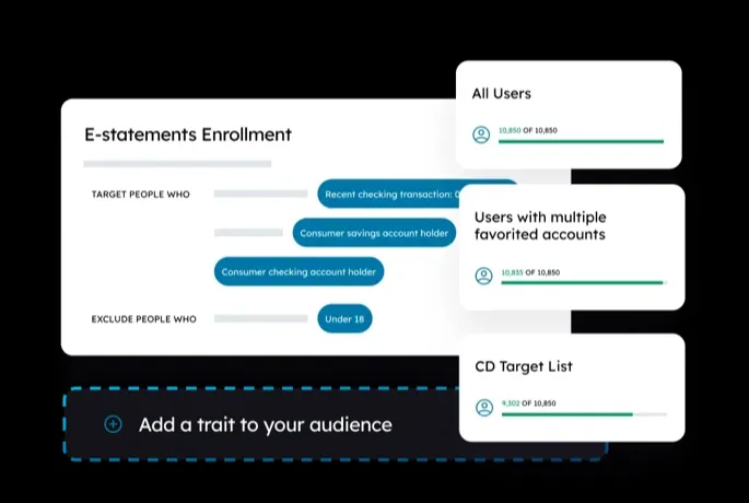 Deploy multiple targeted multichannel marketing campaigns based on account holders’ specific product and service need. Message with precision and personalization. Crafting an effective message is only possible if you know your audience. Segment, export, or promote to granular audience groups in minutes. A predictive approach to selling Use relevant demographic, transactional, and sequential action information to predict behaviors, anticipate needs, and personalize engagements with account holders, providing an enhanced experience for them and increased revenue for you.