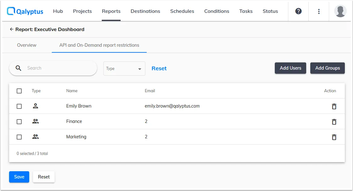 As an administrator, you have many options to manage which user can use Qalyptus Self-Reporting. For each report, choose the users or group of users that can see and generate the report.