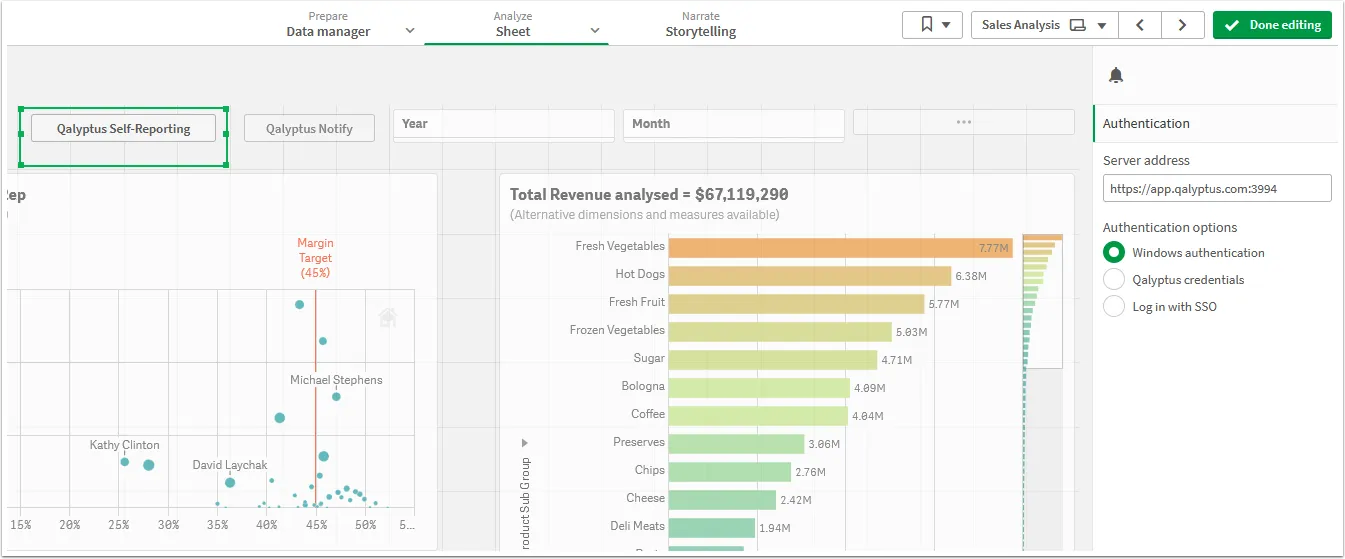 Qalyptus Self-Reporting is a Qlik Sense extension that lets users generate and send customized reports in various formats with filters, recipients, and scheduling options. It supports embedded visuals, advanced user permissions, and multiple authentication methods for secure, flexible self-service reporting.