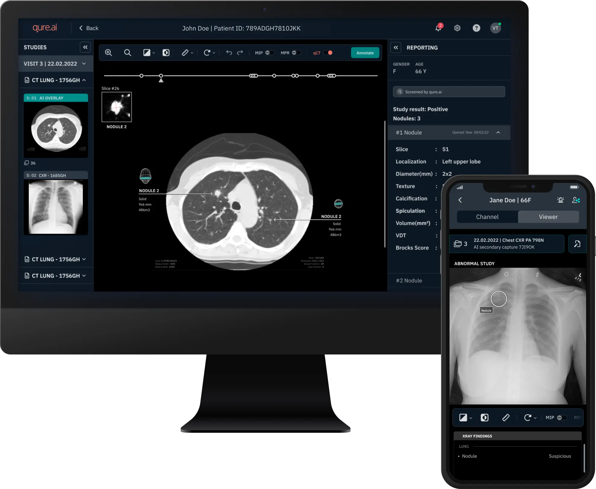 Comprehensive lung nodule management platform that enables care coordination through smart prompts, hardware-agnostic image viewing for AI-annotated Chest X-Rays and CTs, cross-departmental scan sharing, and custom notifications for suspect cases.