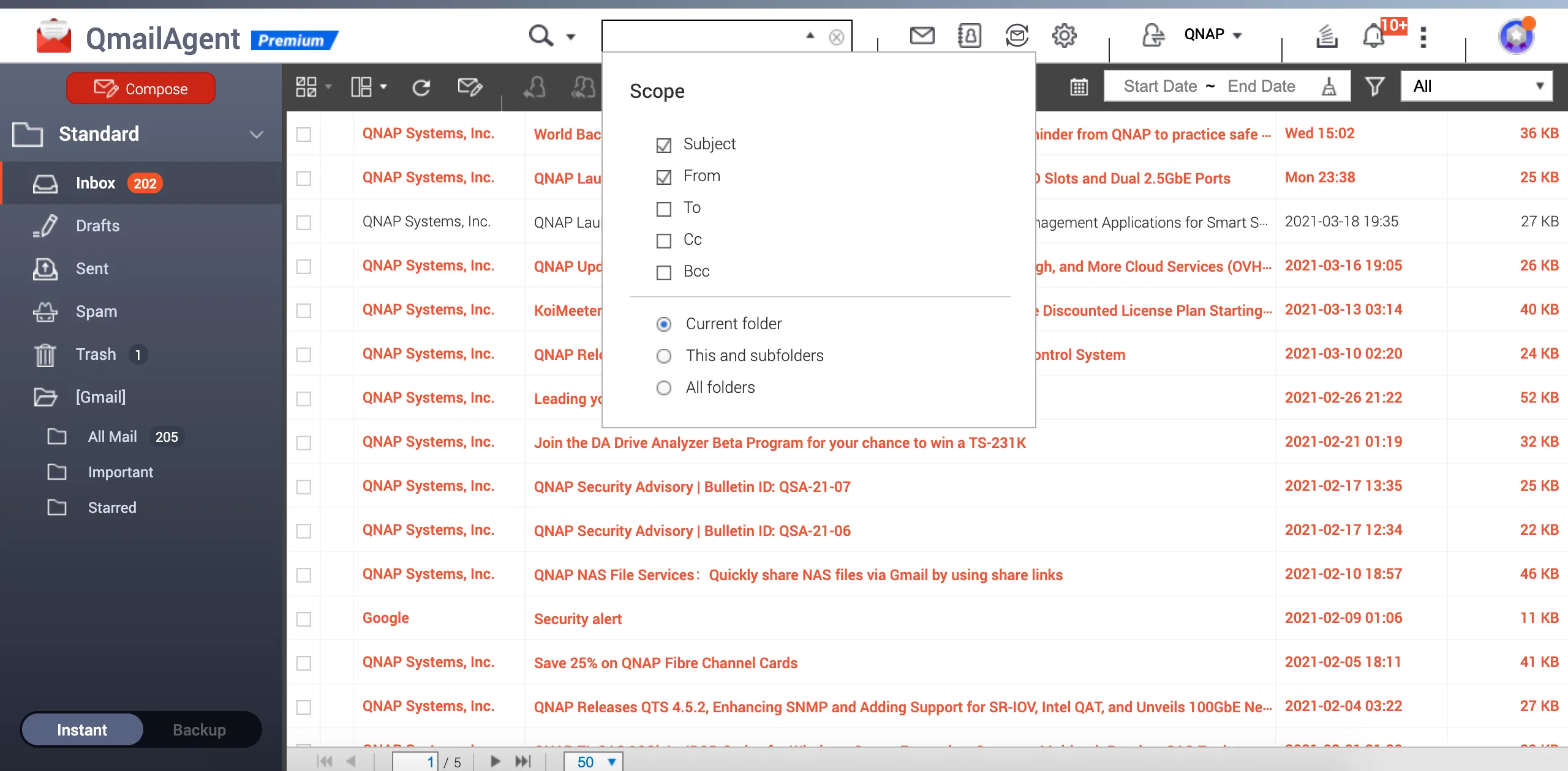 Most email services limit the sizes of attachments. When using QmailAgent, you can share any file (regardless of file size) from your NAS by using “SmartShare” links. These links allow recipients to directly access shared files, making it quick and easy to attach and share large files that would be restricted by most email providers.