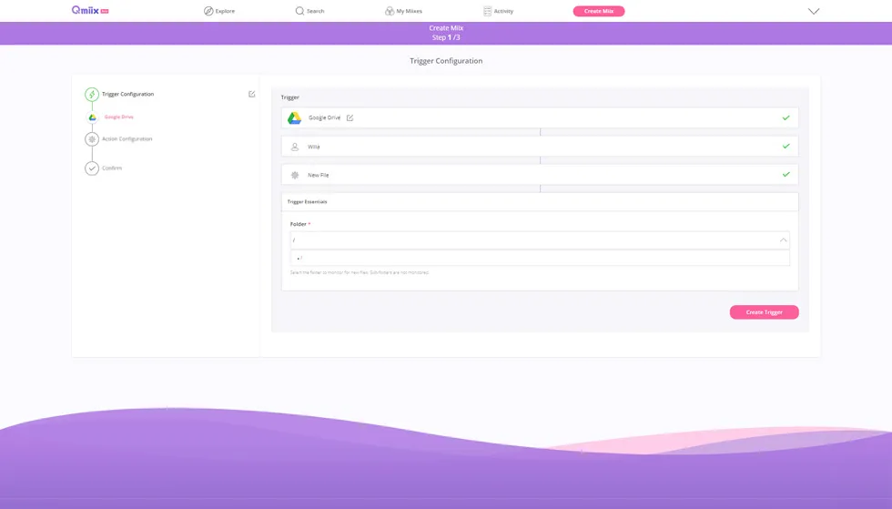 Users create a miix applet using a Trigger and one or more Actions. A Trigger is a pre-defined condition which tells Qmiix to execute an action, an Action is an execution of pre-defined task within the specified app.